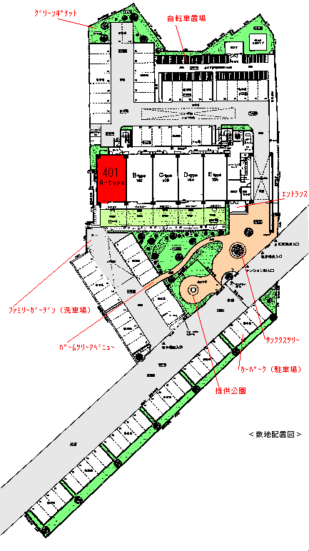 ★カーパーク(駐車場):敷地内に設けられた全戸分の駐車場は全て使いやすい平置きタイプです。